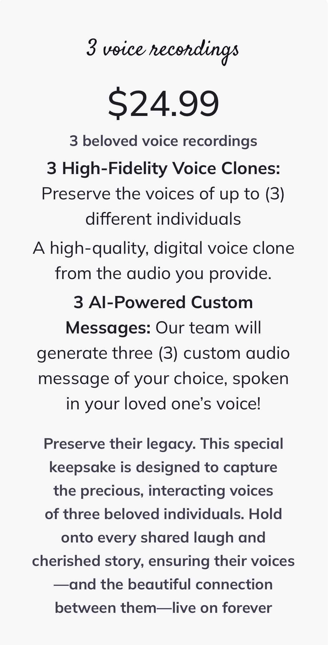 Preserve your loved one’s voice with our three-keepsake offering. Includes high-quality digital voice cloning and AI-powered custom messages.