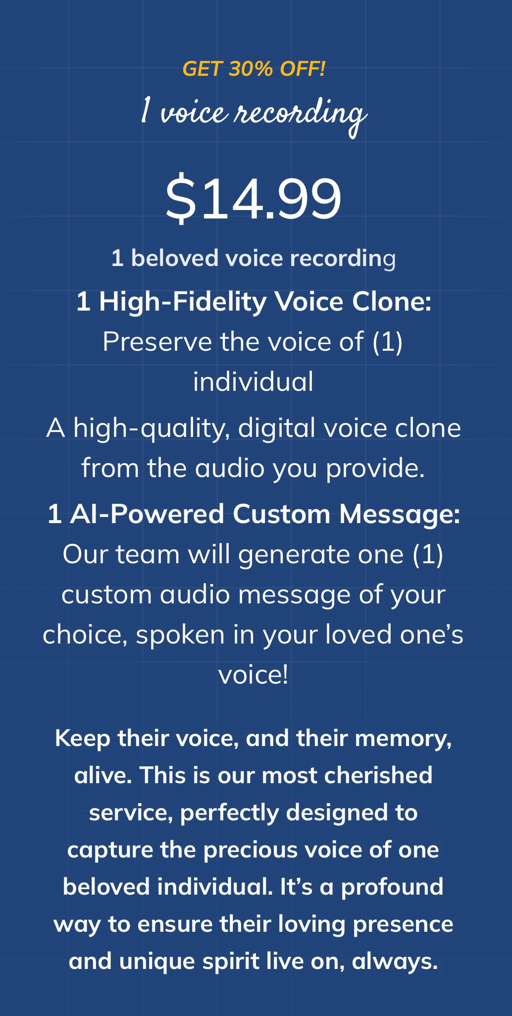 Hold onto the sound of love forever. Using advanced yet gentle technology, we preserve the unique tone and warmth of your loved one’s voice. Whether it’s saving old voicemails or creating a digital voice bank, we give you the ability to hear them say ‘I love you’ whenever you need it most.